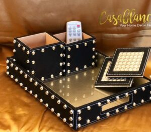 Leatherette décor tray with coasters and holders , Casablanca home décor Hyderabad (@casablanca__homedecor) , Price on request